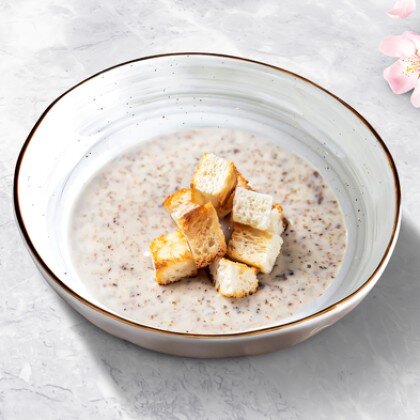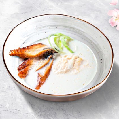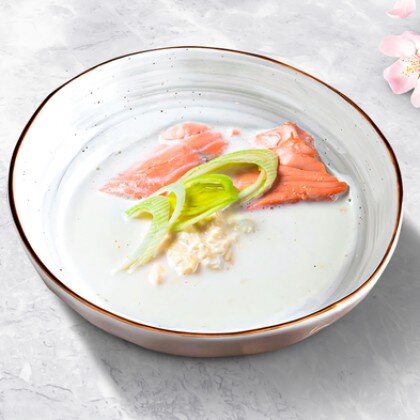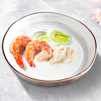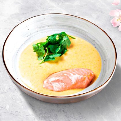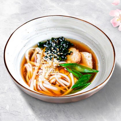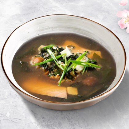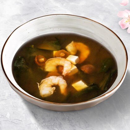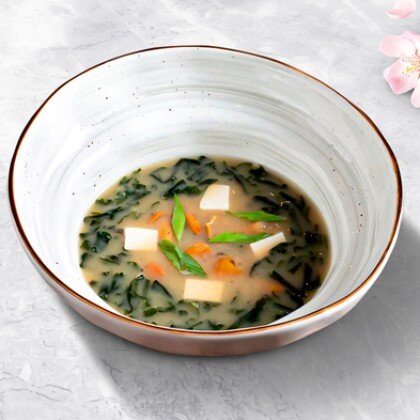 Рыбный бульон хондаши, водоросли вакаме, кунжутное масло, сыр тофу, яйцо, зеленый лук, соус шрирача.