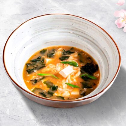 Куриный бульон, лосось, сливки, яйцо, рис, лук порей.