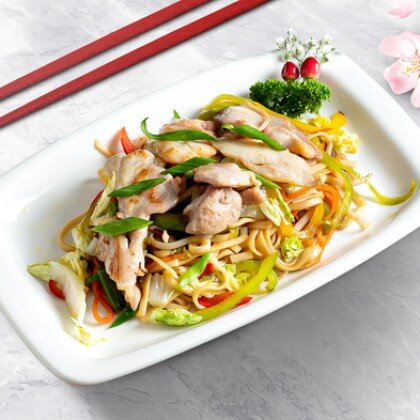 Куриное филе, рис, яйцо, репчатый лук, зеленый лук, соус саппоро, кунжут.