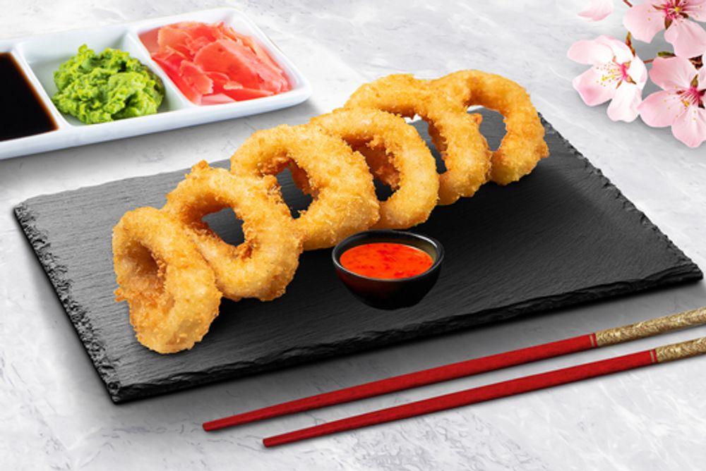 Кальмар, сухари панко, кляр темпура, соус кисло-сладкий.