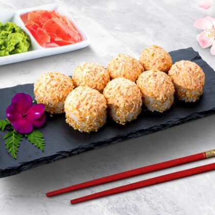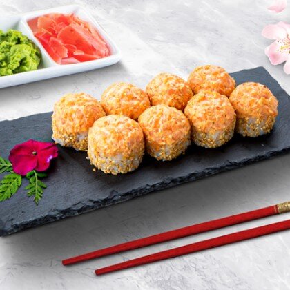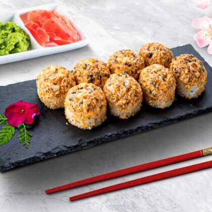 Тунец, огурец, авокадо, рис, водоросли нори, спайси соус, кунжут.