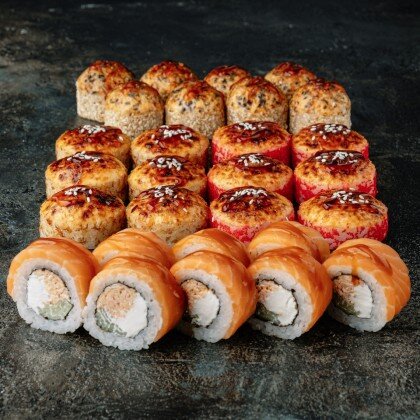 Запеченная ассорти (креветка, угорь, краб, лосось) Филадельфия ассорти (креветка, лосось, тунец, угорь)