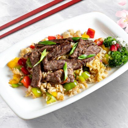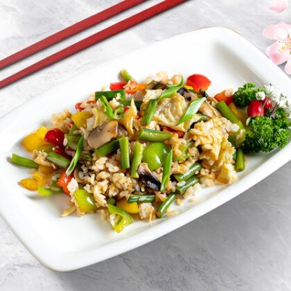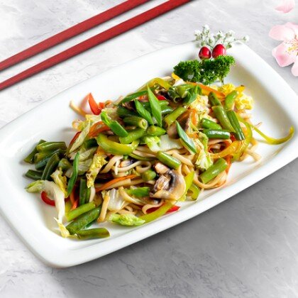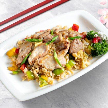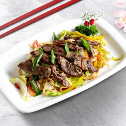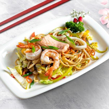Куриное филе, лапша удон, репчатый лук, перец паприка, китайская капуста, морковь, чеснок, зеленый лук, соус саппоро.